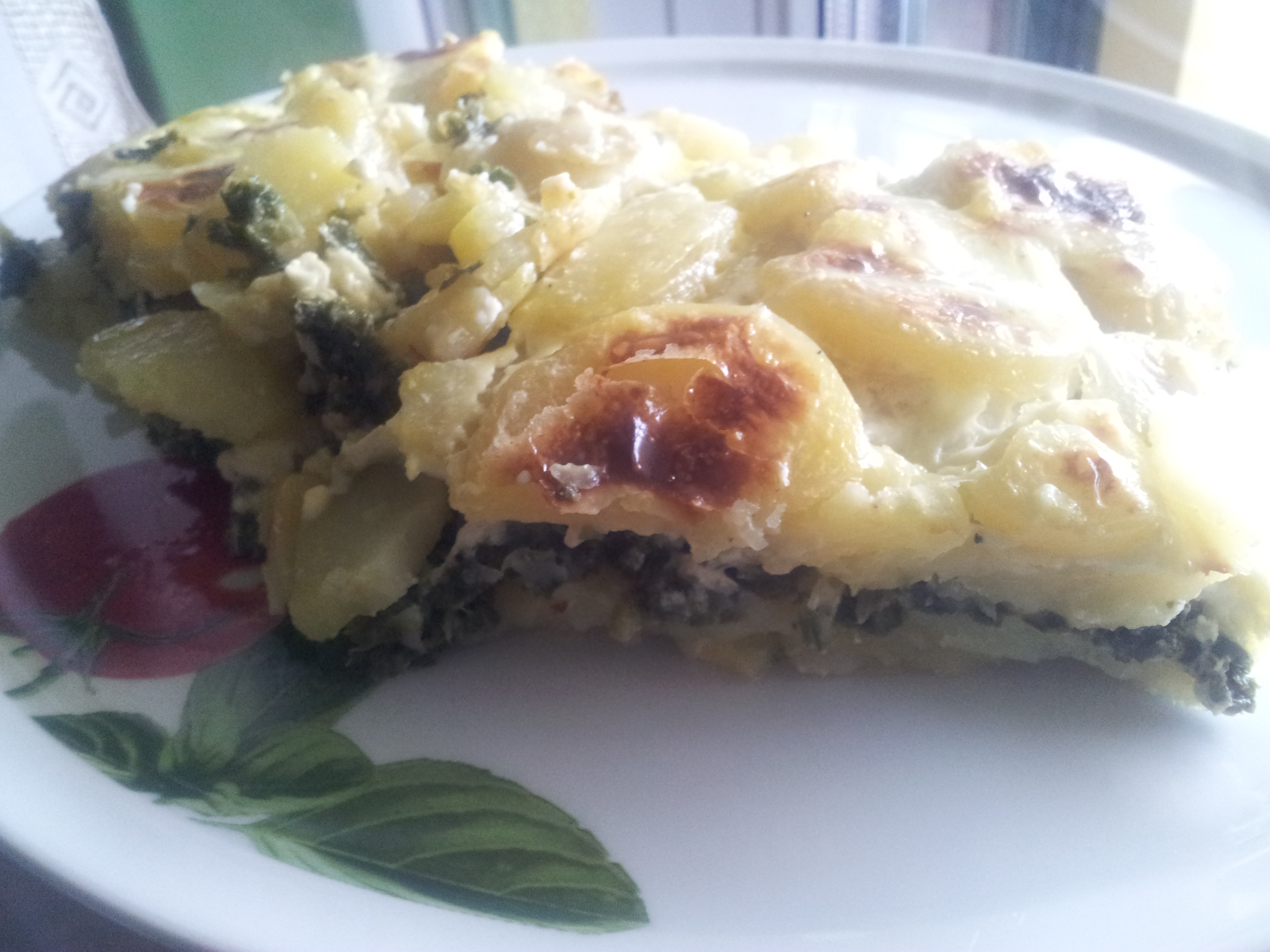 Malo pomrznjeni listi ohrovta so bili ravno prav omehčani za nadev. Narezala sem ga na trakove in prelila z vrelo vodo (da se še dodatno zmehčajo). Olupila in narezala sem čebulo in par strokov česna. Na malček olju sem zdušila najprej čebulo in nato še narezan česen. Potem sem dodala še narezan in odcejen ohrovt, posolila, popoprala in še malo kumine (mlete seveda), ker ohrovt brez nje, zame tudi ni pravi. Na koncu še malo narezanega peteršilja (ker sem ga ravno imela pri roki) in vse skupaj zdušila še malo, do mehkega. Medtem sem skuhala tudi cel krompir, ga nato odcedila, olupila in narezala na ploščice/rezine. Zložila sem jih na dno pomaščenega pekača in nato po krompirju porazdelila nadev iz listnatega ohrovta. Temu je sledila še ena plast krompirja. Seveda je lahko plasti kolikor človek želi, jaz pa ponavadi naredim kar tro-slojno (z nadevom v sredini). Posebej sem zmešala smetano za kuhanje, eno jajce in v to naribala še nekaj sira (lahko Edamca), ter solila in poprala po potrebi. S tem sem prelila zloženko in postavila vse skupaj v ogreto pečico na dobrih 200 °C za kakšnih 15 minut, da se preliv lepo poveže in dobi lepo zlato/rjavo skorjico.