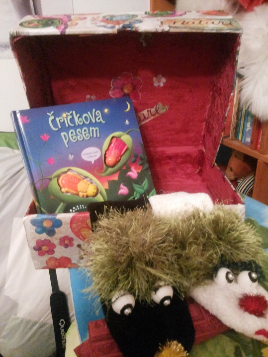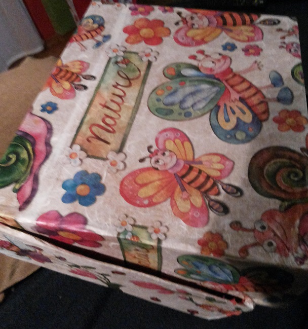 Naslednje dneve sem s servietno tehniko oblepila še kartonasto škatlo, ki mi jo je Velecenjeni prinesel iz službe, vanjo položila knjigo o travniških živalicah, na vrhu pa je kraljeval naš zaljubljen parček Žverčevih.