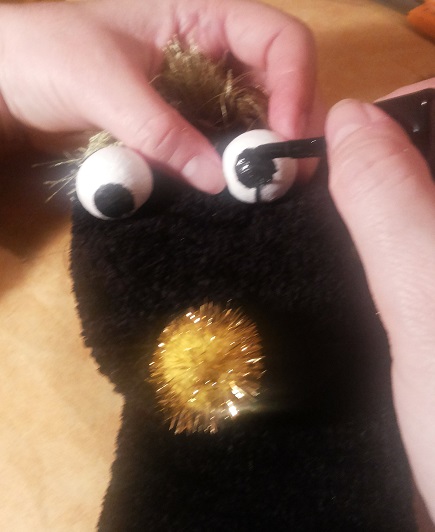 s črnim lakom za nohte narisala zenico, Pehta pa je na sredino prilepila še pol perlice za bolj sijajen pogled. Dodali sva še trepalnice. G. Žverca je dobil takšne prave ženske iz drogerije, ga. Žverca pa malo bolj poudarjene, ker je pa le ženska (še dobro, da se je bližal pust in sem jih staknila v trgovini med