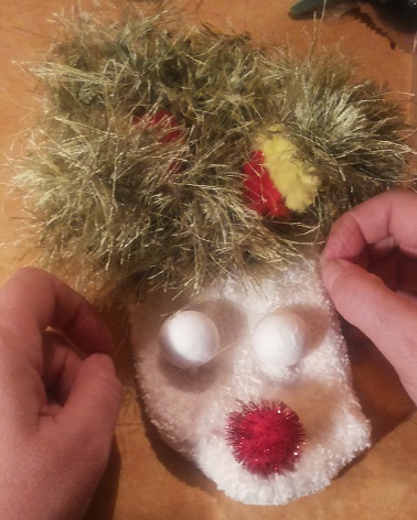 lase sem dobila super razmršeno zelenkasto volno. Super je služila kot griva za obe Žverci….edina slaba lastnost pa je bila, da so vsaj od začetka precej odpadale nitke. Upam, da se bo “čupa” s časom stabilizirala..he, he. Gospod Žverca je dobil tako frizuro ala Rod Stewart, gospa pa dva navihana čopka, ki sem ju povezala z raznobarvnimi kosmatimi žičkami. Za njune očke sem uporabila stiroporne kroglice na katere sem