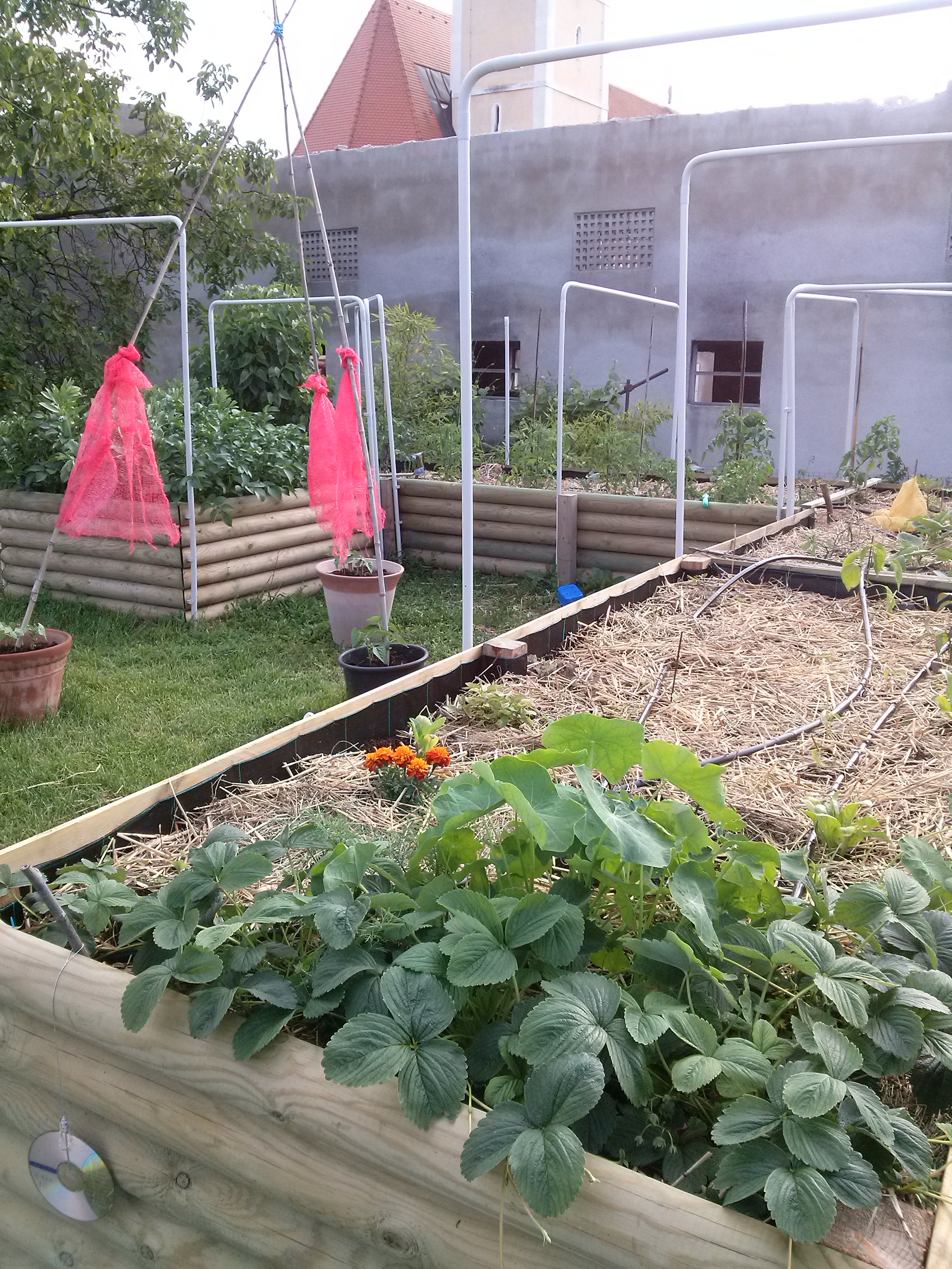 Na mojih visokih gredah se pod zastirko v mešani zasaditvi tako lahko najde vsakega po malo: nekaj zgodnjega krompirčka, boba, nizkega fižola, kar nekaj vrst paradižnikov, bazilika, peteršilj, šetraj, brokoli, cvetača, zelena cvetača, koleraba, zgodnje zelje, por, liči, volčje jabolko, afriške kumare kiwano, nizka sladka koruza, malo solatke, različni jajčevci, rjava in rdeča paprika za pečenje, feferončki, stoletni česen……celo nekaj sadik graha, ki sem ga presadila z vrtne grede in ga rešila pred bramorjem, se je prijel. Pa tudi rožice so vmes: kapucinke, ognjič in tagetes. Ob robu grede pa sem zasadila bele jagode, ki lansko leto v velikem loncu niso hotele narediti niti enega plodu. bomo videli kako jim bo letos všeč v visoki gredi.